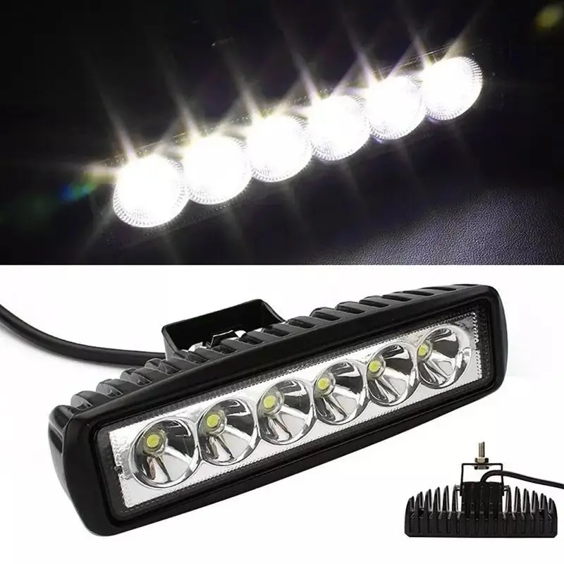 Вытянутая форма. 6 мощных диодов (Epistar) вых. мощностью 1 Ватт с диаметром линзы 1,7 см, расположенных в один ряд на радиаторе. световой поток 1380 люмен. Вес 0,2 кг. Тип корпуса: алюминий. Габариты: 155-45-45. Подходят в качестве ДХО.