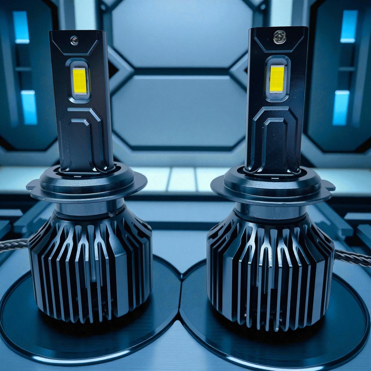 Серия сверхярких светодиодов H7 RAM TRUCK 4500K - Диоды этой серия снабжены стабилизатором напряжения самого широкого диапазона: 9-48 Вольт. В диодах серии Truck мощность стабилизирована на 45 ватт, что позволяет системе охлаждения поддерживать температуру радиатора до 60 градусов Цельсия. При этом световой поток после прогрева не опускается ниже 4500 Люмен (каждая лампа). Диагональные световые пропилы, утопленный чип и точное фокусное расстояние делают модель идеальной для рефлекторной оптики легковых и грузовых авто. Цветовая температура 4500K.