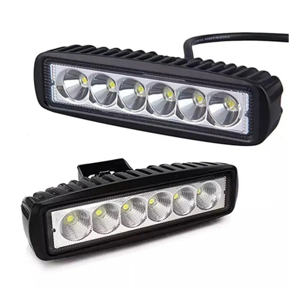 Вытянутая форма. 6 мощных диодов (Epistar) вых. мощностью 1 Ватт с диаметром линзы 1,7 см, расположенных в один ряд на радиаторе. световой поток 1380 люмен. Вес 0,2 кг. Тип корпуса: алюминий. Габариты: 155-45-45. Подходят в качестве ДХО.